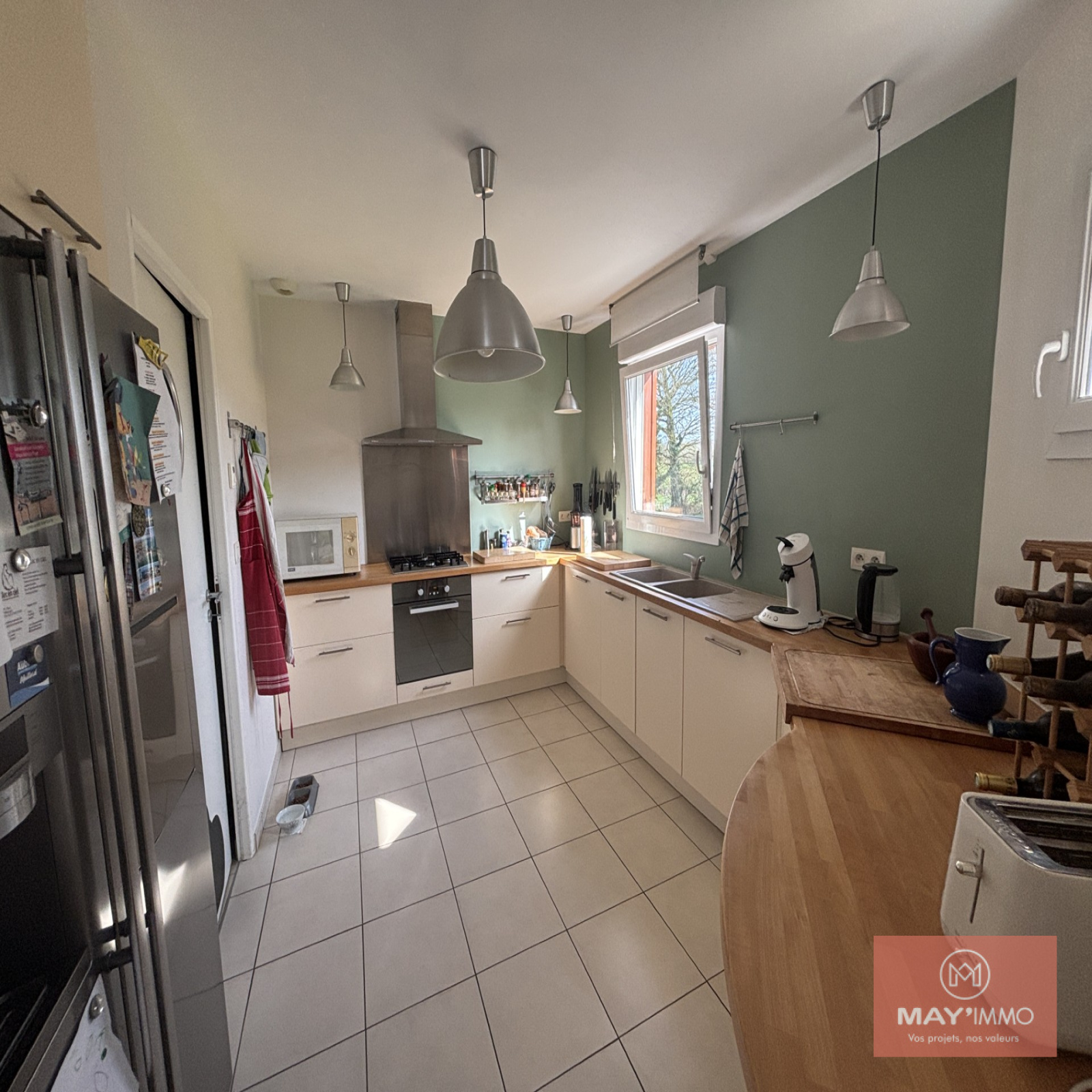 Dès l’entrée, vous serez séduits par une pièce de vie lumineuse avec son poêle à bois, idéale pour des moments chaleureux en famille. La cuisine aménagée et équipée s’ouvre harmonieusement sur l’espace de vie.