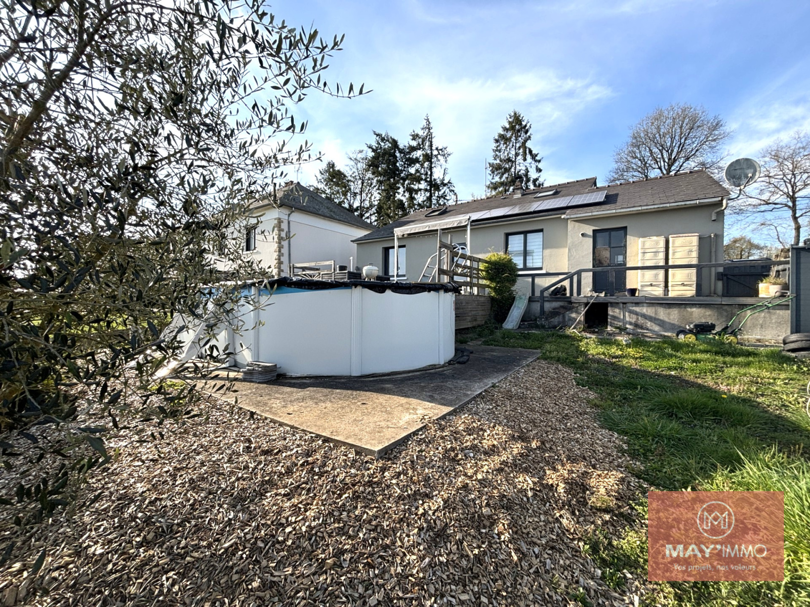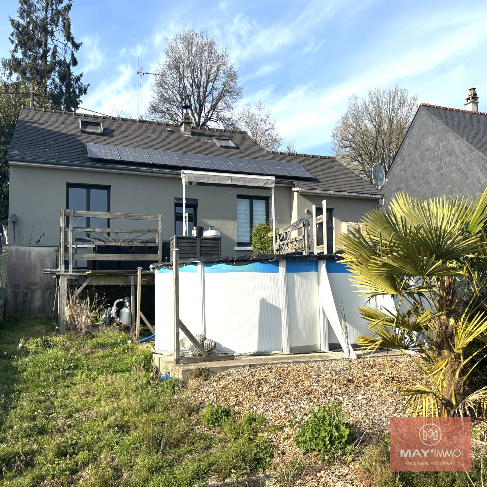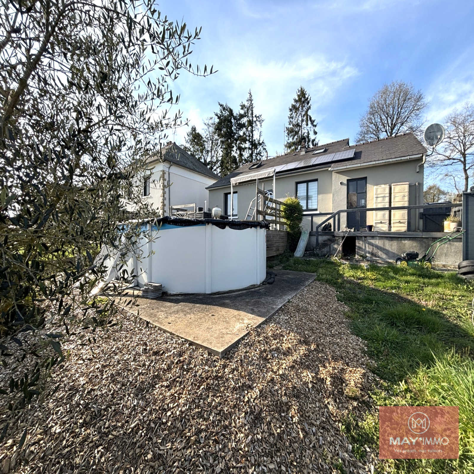 Terrain clos d’environ 800 m² avec terrasse bois et piscine hors-sol.