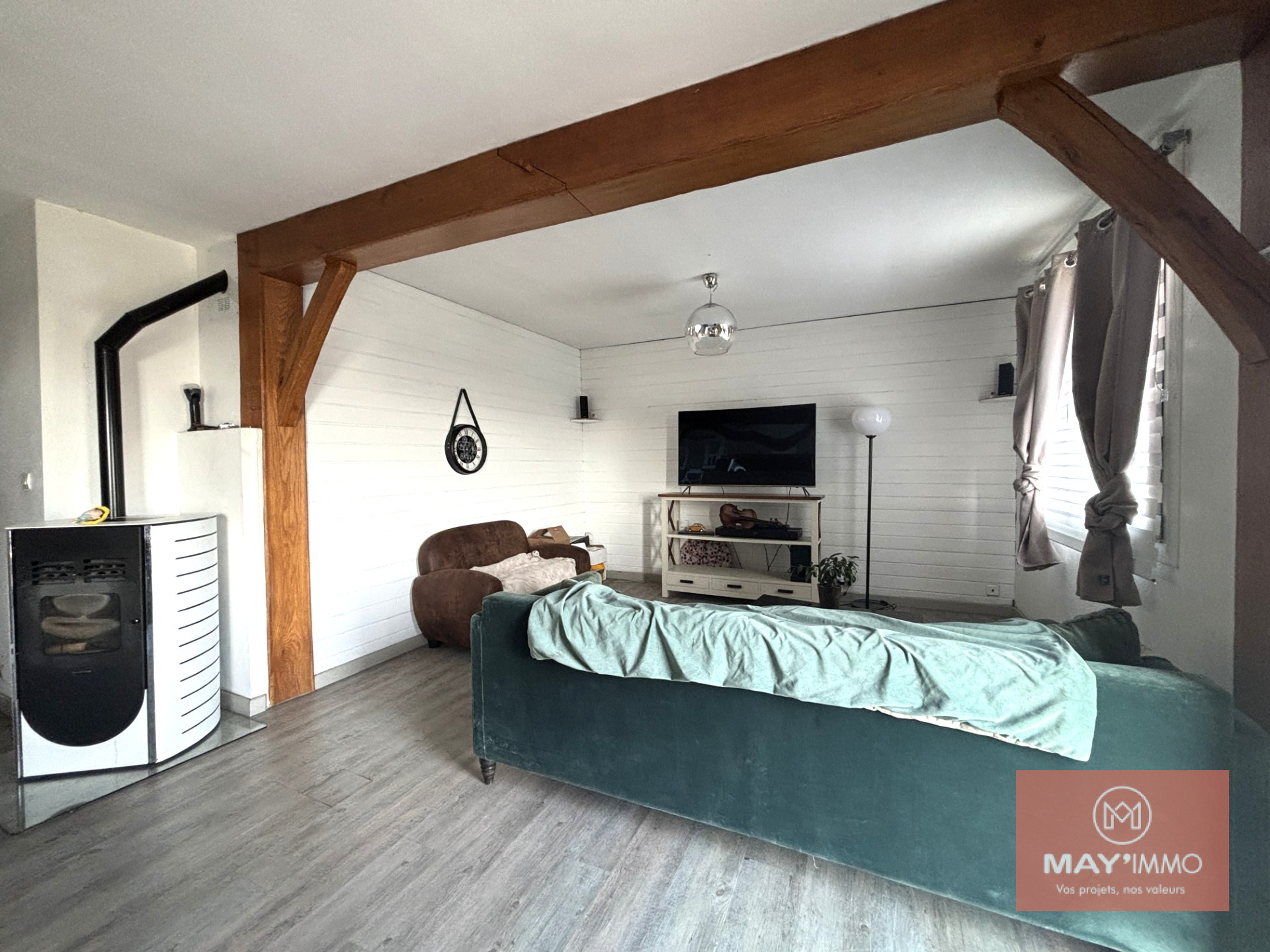 Équipements : double vitrage PVC, poêle à granulés programmable, radiateurs électriques. Panneaux solaires en autoconsommation (2021) + chauffe-eau thermodynamique.