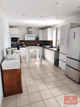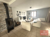 Au rez-de-chaussée, une entrée desservant un salon/séjour lumineux avec poêle à bois, une cuisine aménagée et équipée, ainsi qu’un toilette avec lave-mains.